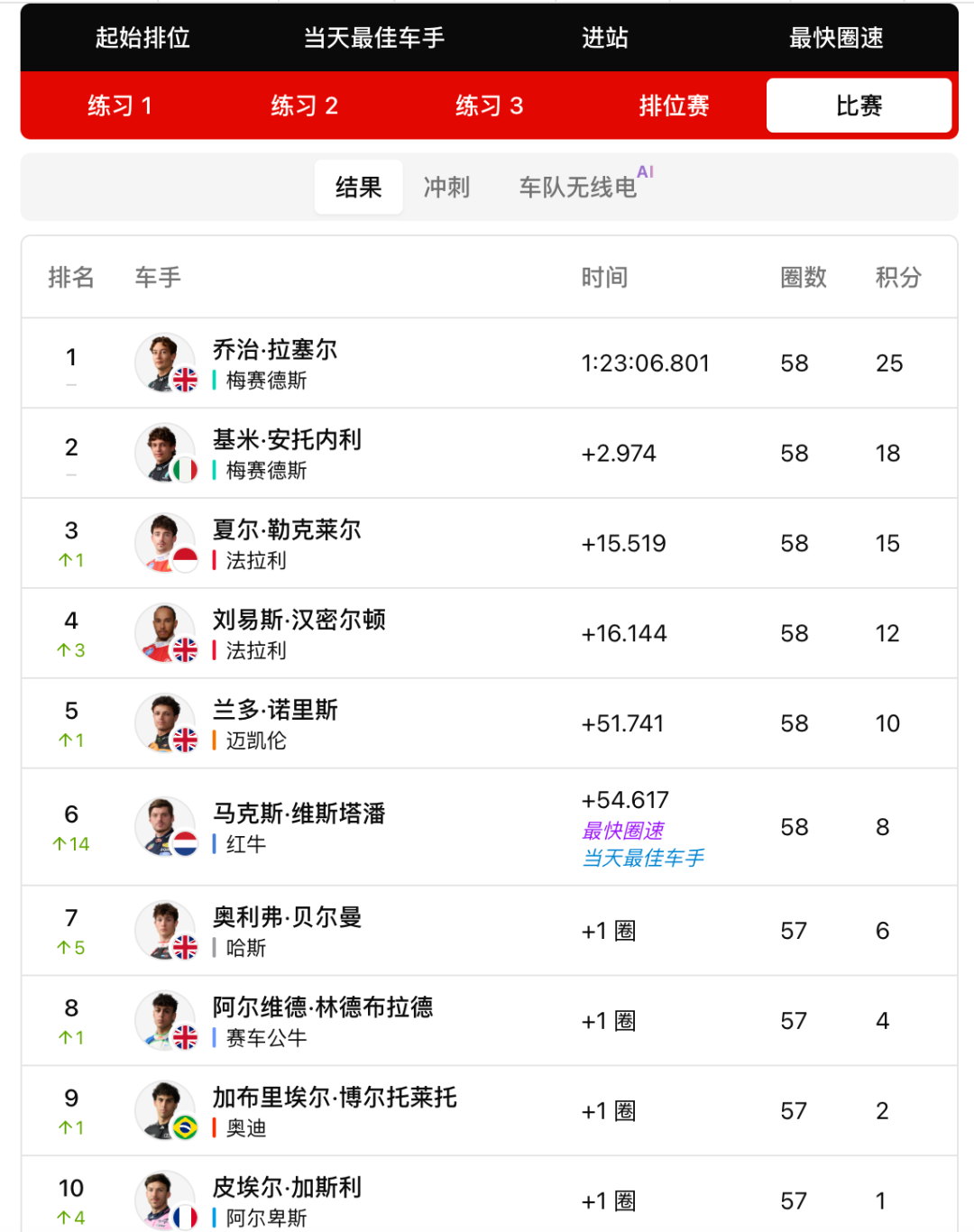 紧接着的正赛中,拉塞尔一路稳健领先,最终摘得本站冠军,新秀安东内利也惊艳地收获亚军席位,而法拉利车队的勒克莱尔则最终拿下季军。